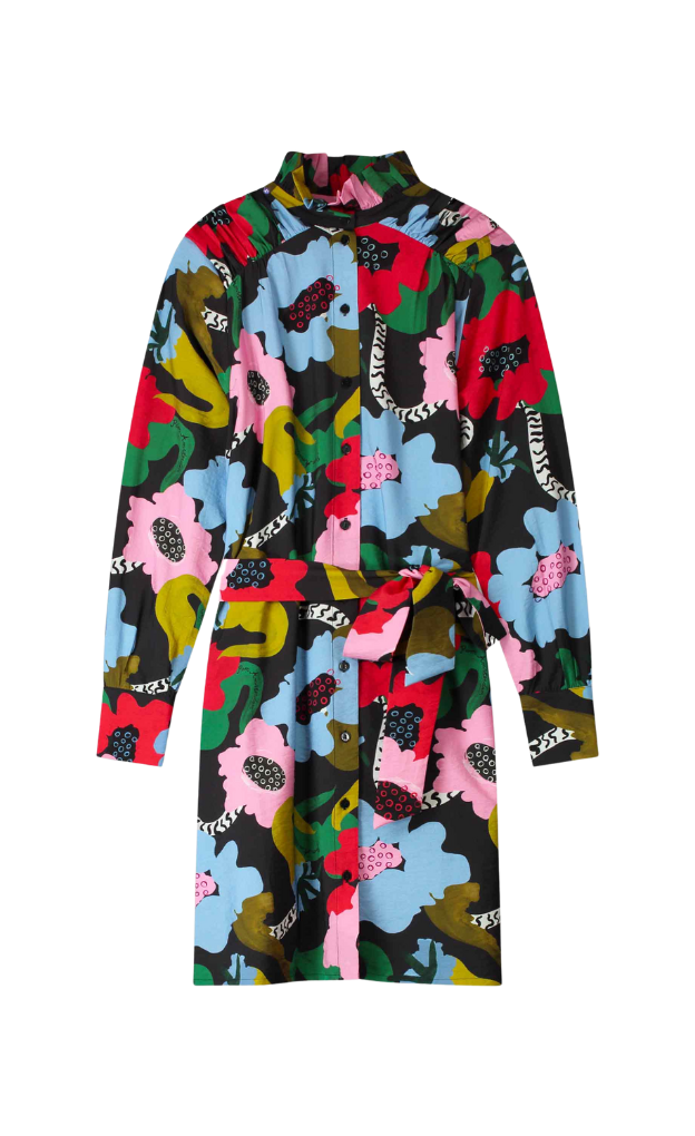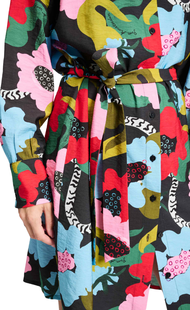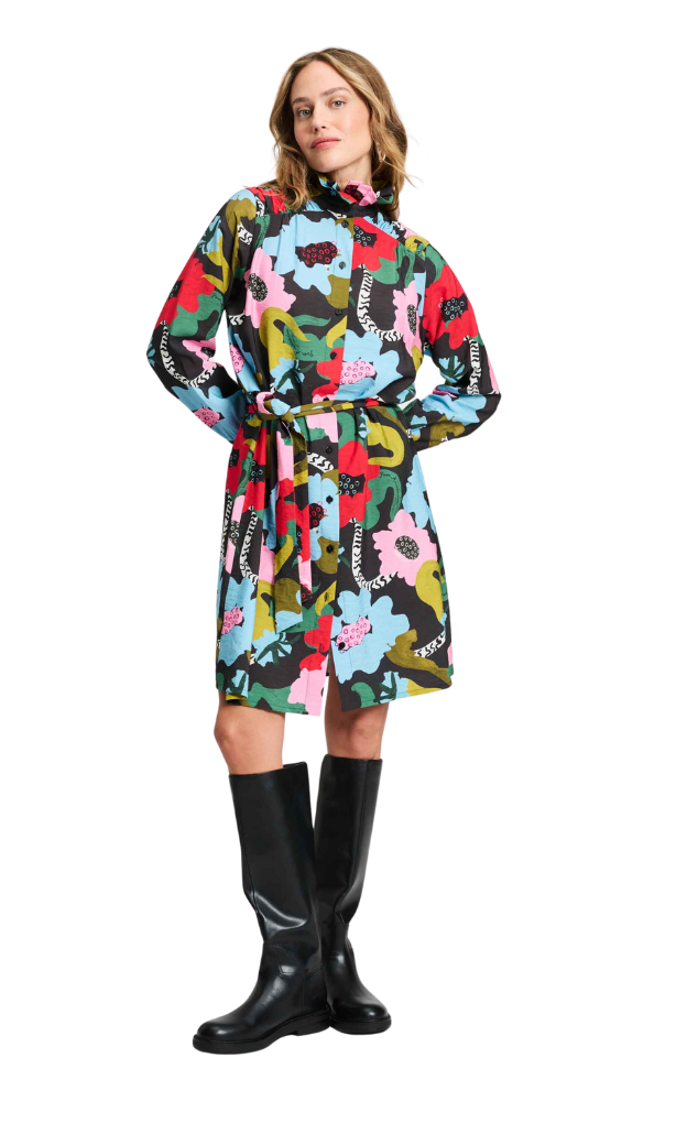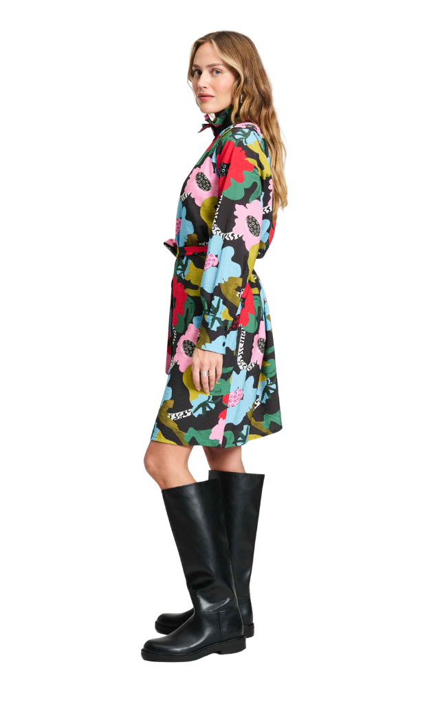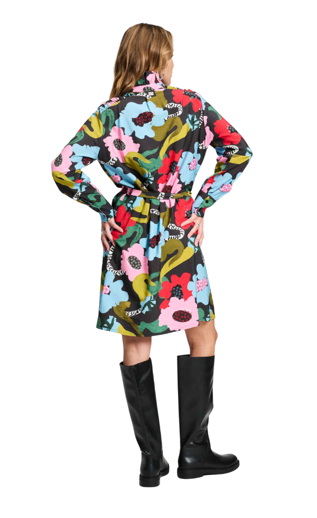 This dress is a real eye-catcher thanks to its colorful floral print. The tie belt creates a beautiful waist, and the lightly textured fabric makes it comfortable to wear.