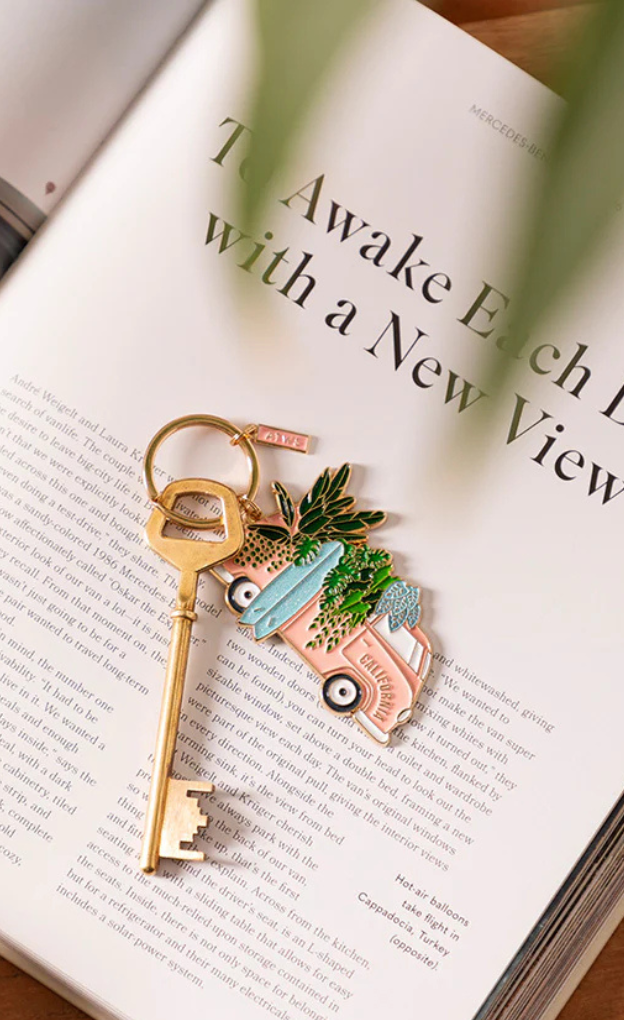 Escape to the beach with the Surf Van keychain. This colorful enamel design, finished with gold accents, captures the free spirit of seaside adventures. Perfect for adding a touch of sunshine and wanderlust to your keys or bag. πŸ–οΈπŸš