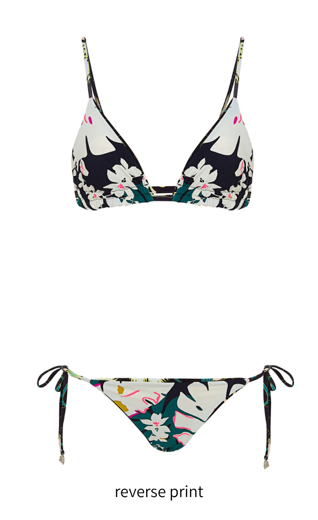 The Lydia is a sliding triangle bikini top with one big difference - more support! With a wider band and cinching, your triangles are sure to stay put. And with a reversible print, the sky (and sea) is the limit.