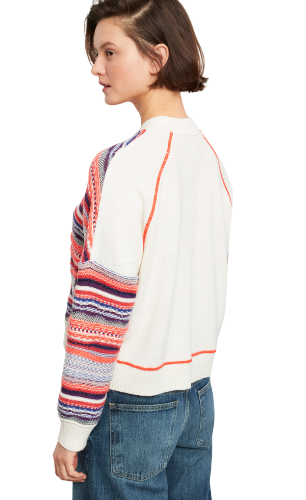 The Galana Cardigan is one of those pieces that stops you in your tracks — and that is entirely by design. Each season, Aldo Martins produces signature knit textures in one of their boldly original colour combinations, and the Galana is this season's showstopper. The cream back and sleeves give way to an explosion of textured stripe patterning across the front panels and collar, with neon orange contrast piping and seam stitching tying the whole look together with a flash of attitude. This is the Avant-Garde Line at its finest: unexpected, energetic, and utterly covetable.