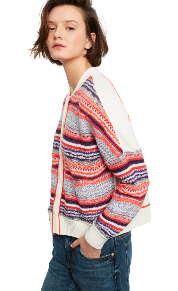 - Rich, chunky mixed-stitch knit with varied textures across the stripe pattern