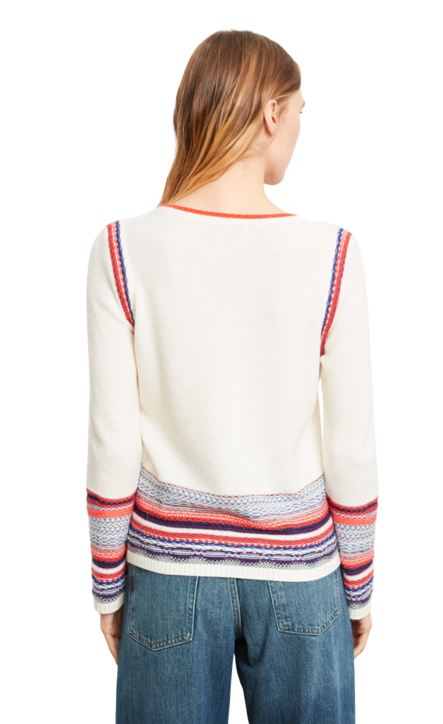 - Cream knit sweater with multicolour textured stripe band at forearms and waist