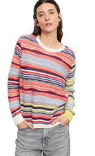 - All-over multicolour horizontal stripe knit sweater in lime green, blue, purple, orange, and white