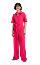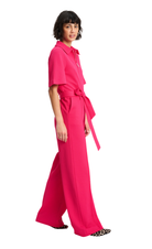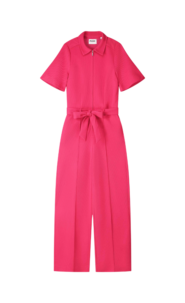 This all-time favourite jumpsuit is now available with short sleeves. The bright pink piece is made from a firm, comfortable piqué fabric with texture. The jumpsuit features a tie belt to accentuate the waist, a zipper closure and long straight legs.