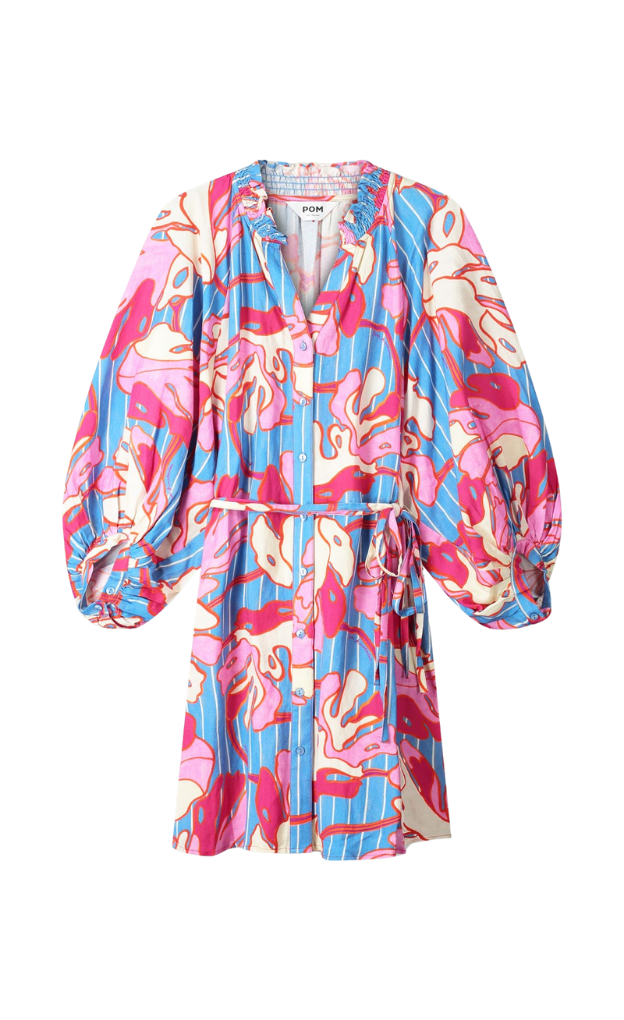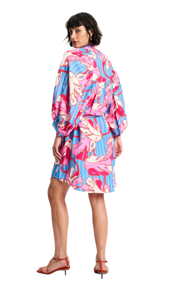 This dress with blue stripes and an artistic pink floral print is a real eye-catcher. The airy linen-viscose blend gives the dress a natural look. The smocked ruffles along the neckline and voluminous puff sleeves create a feminine silhouette.