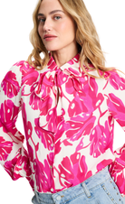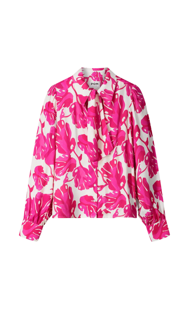 This blouse features a pink leaf print on a light ecru background. Made from LENZING™ ECOVERO™ viscose, it drapes beautifully and feels comfortable to wear. The detachable bow detail at the neckline adds a feminine touch.