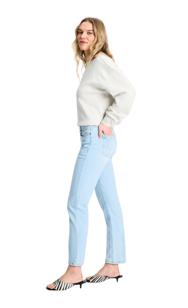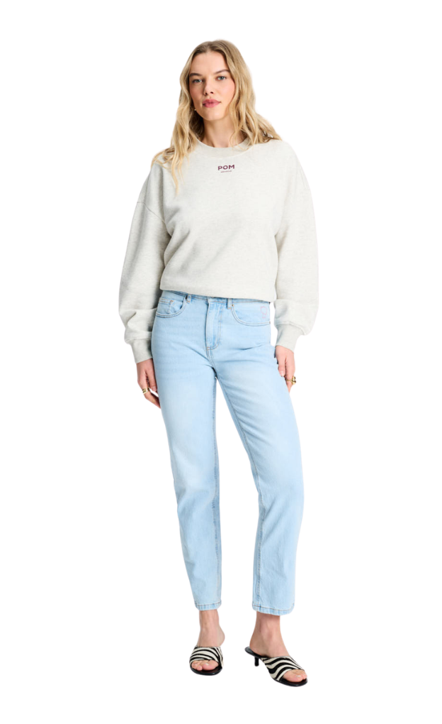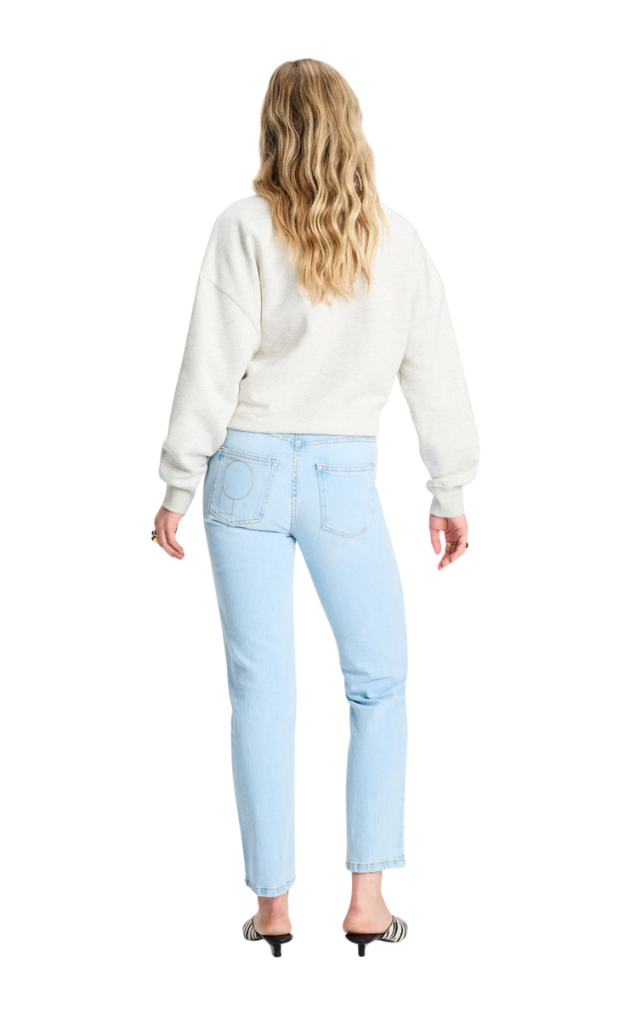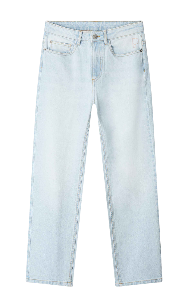 This colourway of jeans runs true to size. Your new everyday jeans. These tapered jeans in mid blue have a flattering high waist and straight legs. The embroidered "P" on the back pocket adds a subtle touch.