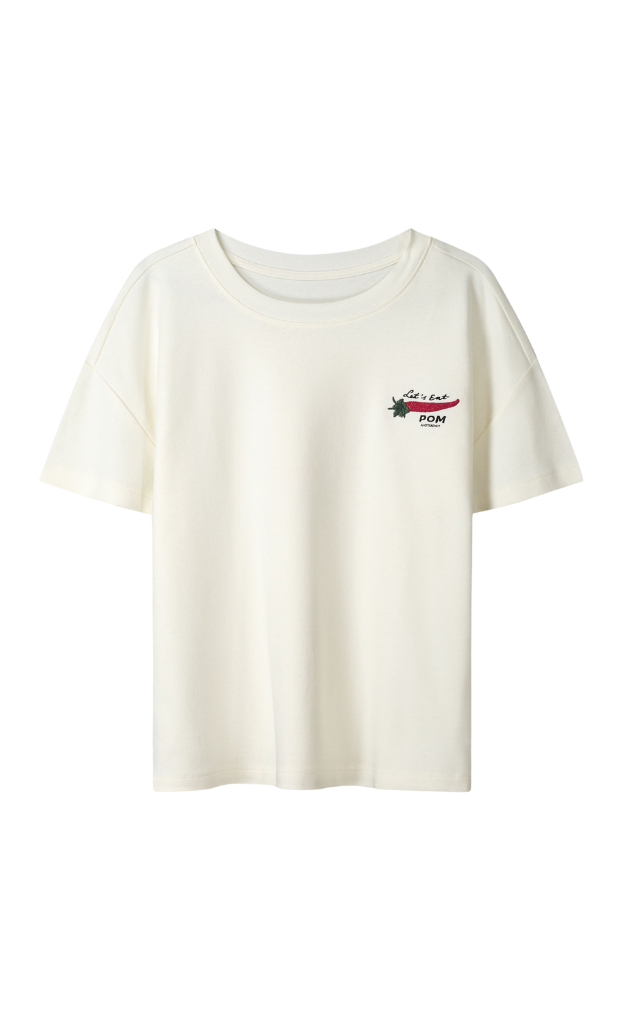 Simple with a spicy twist. This 100% organic cotton T-shirt has a clean design with a small chili pepper illustration and the text "Let's eat."