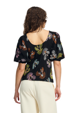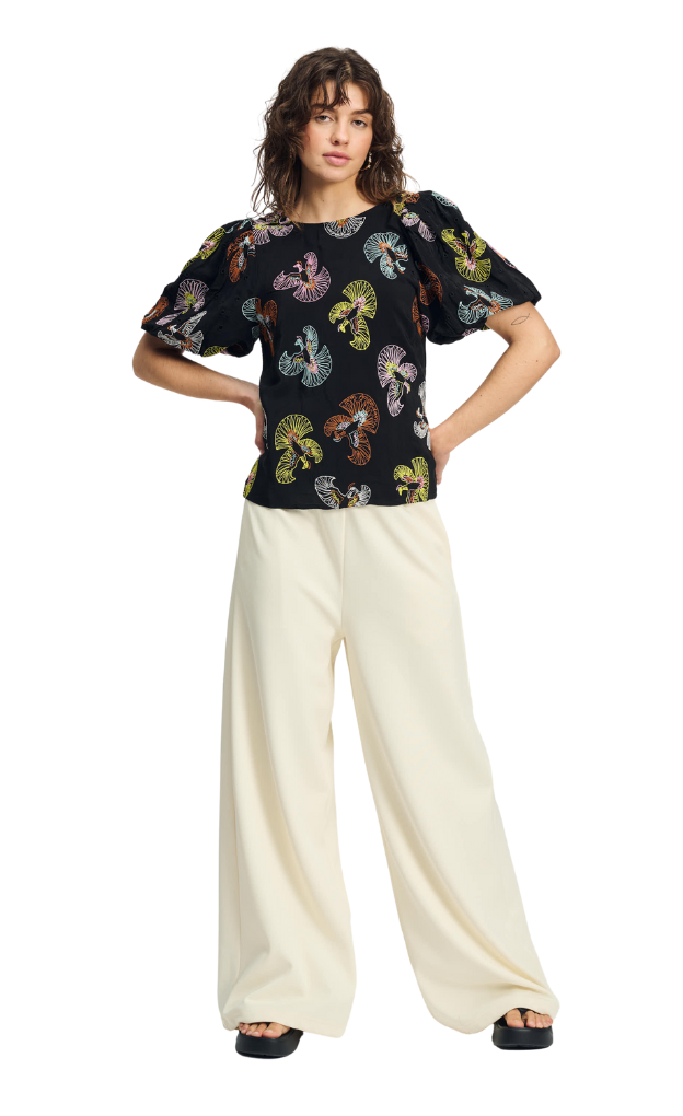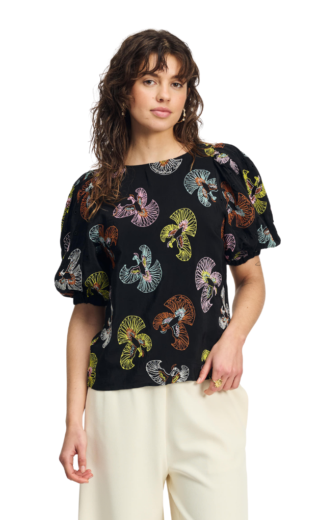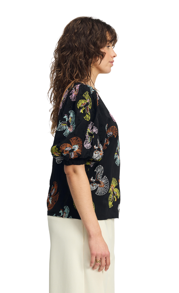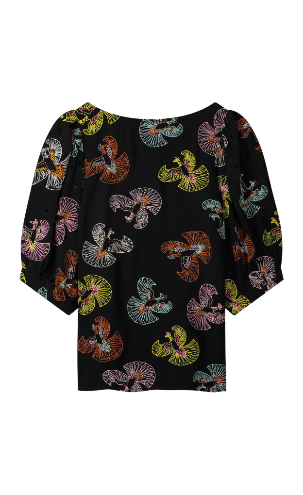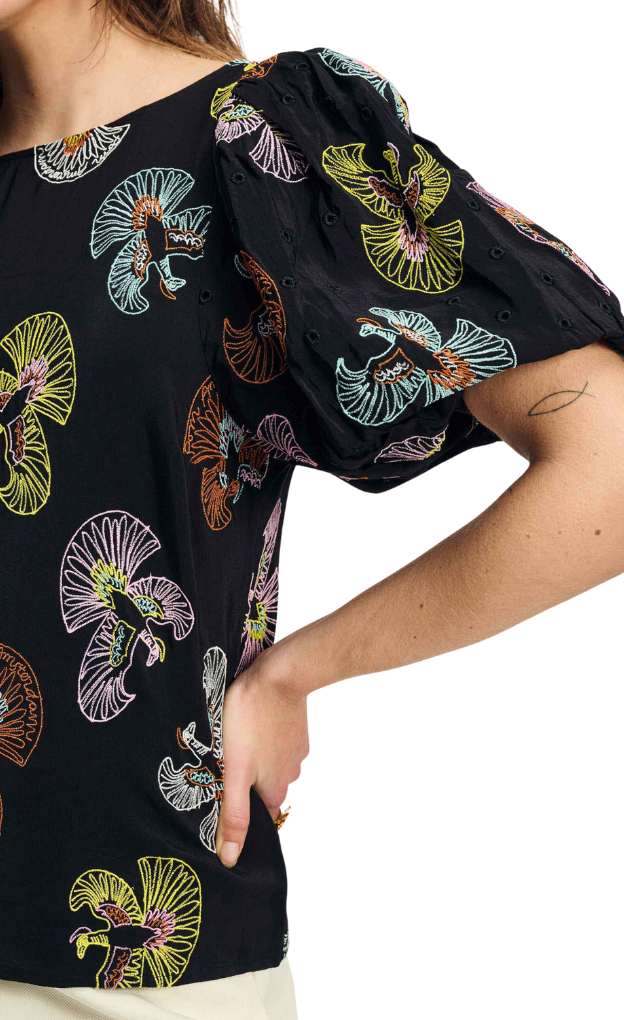 Discover this black top featuring embroidered birds in a range of colours. The top has playful puff sleeves with eyelet embroidery and a low-cut back. It’s made from 100% viscose.