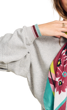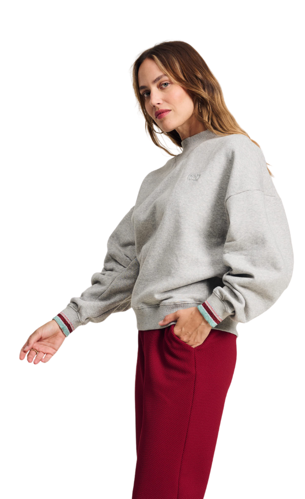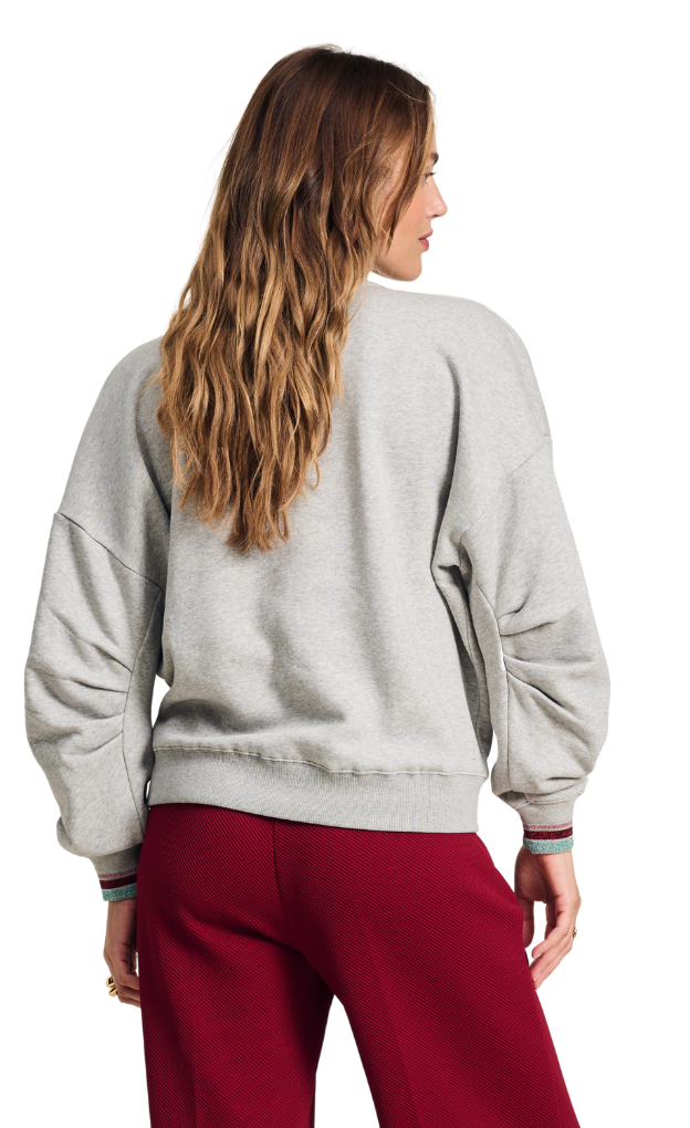 The jumper has pleats in the sleeves, creating a puff sleeve effect. The fabric of the sweater is made of 80% organic cotton, making this a more sustainable item.
