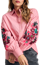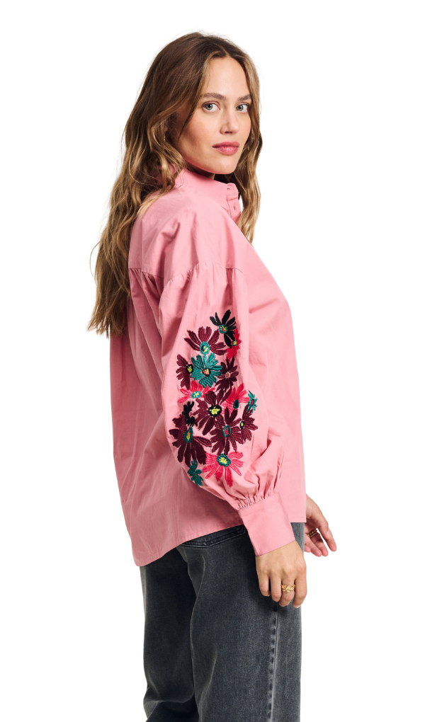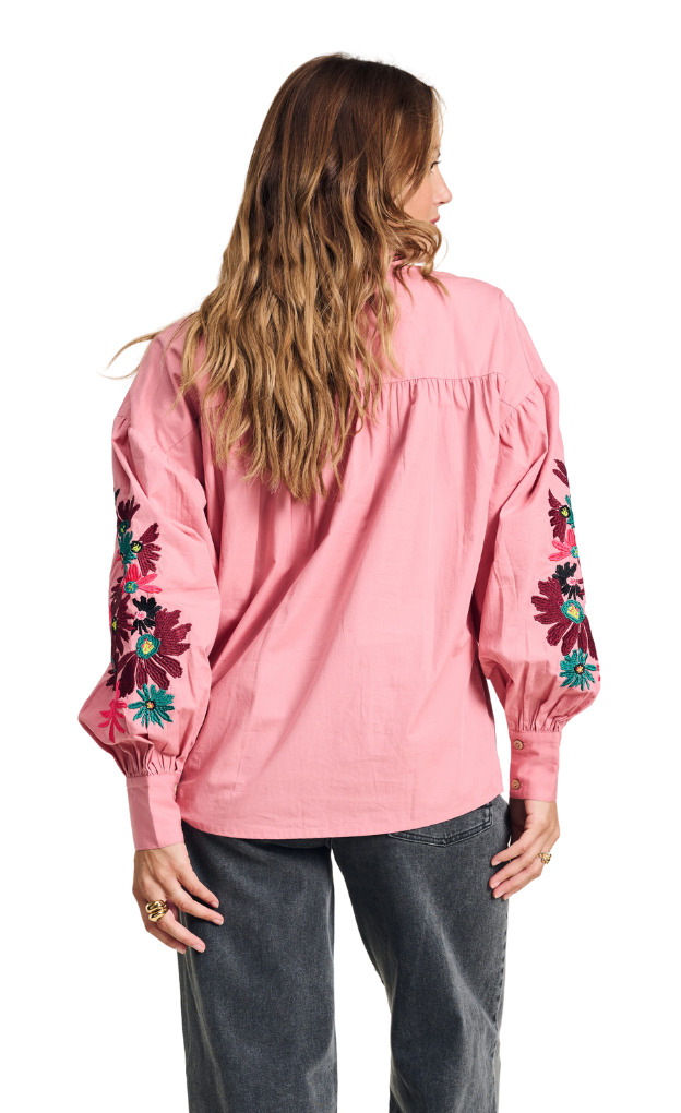 This pink blouse has a beautiful embroidered floral print on the sleeves. The blouse is made of 100% organic cotton, making this a more sustainable item.