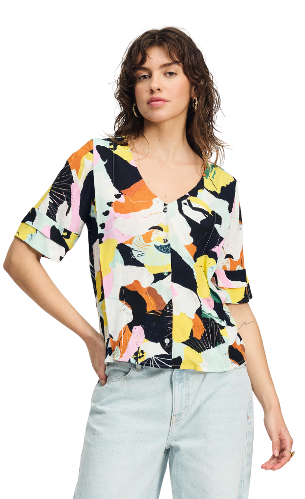 This colorful blouse features a unique print with birds. Finished with a V-neckline and buttons. The blouse is made from LENZING™ ECOVERO™, making it 'more sustainable'.