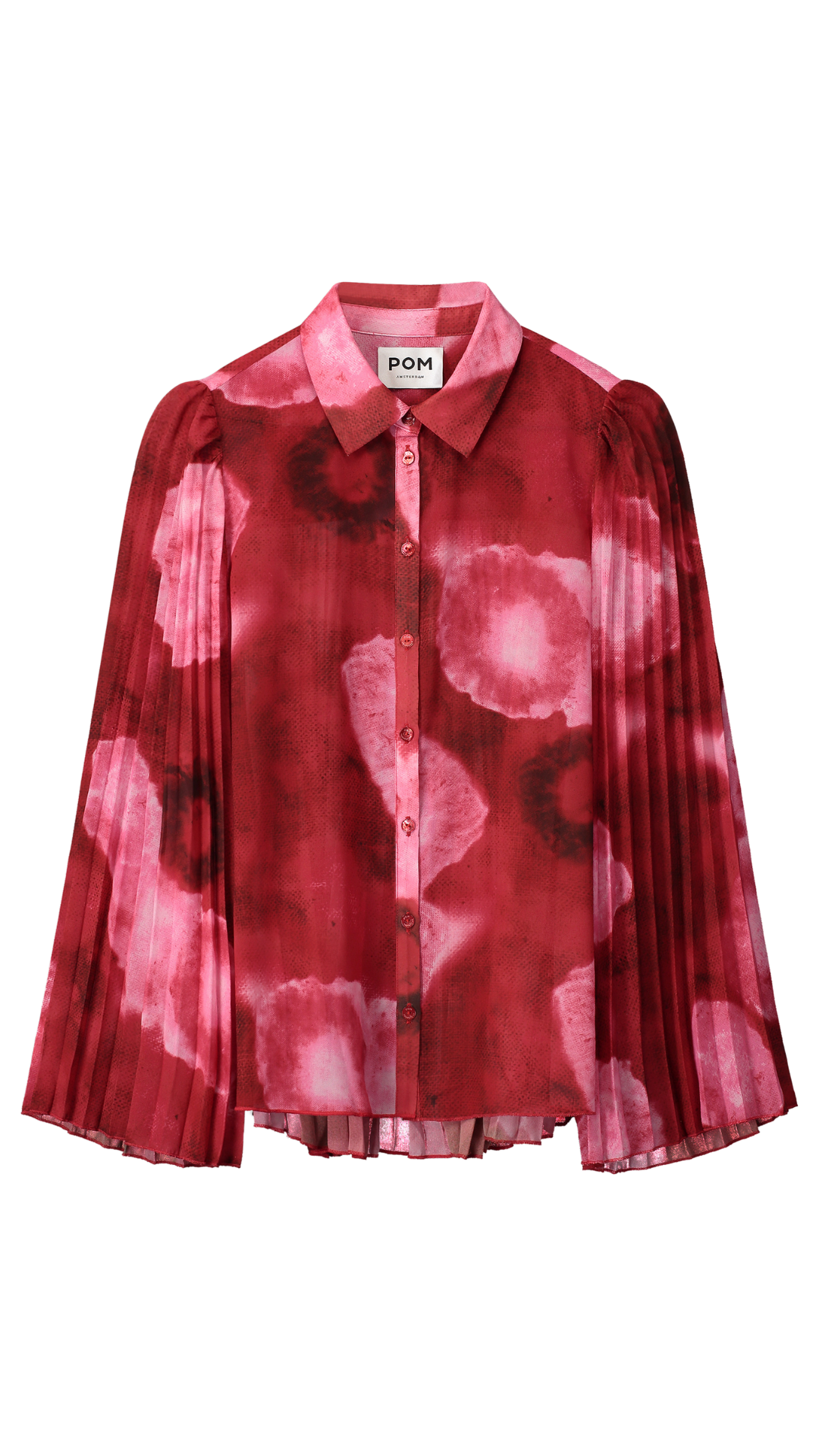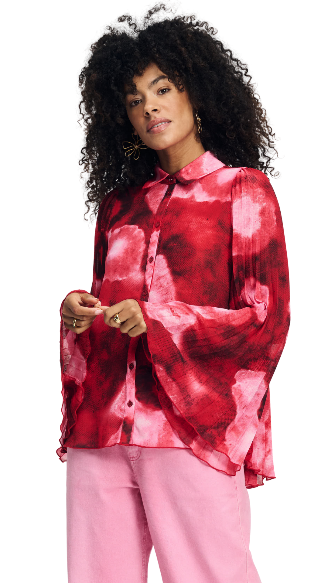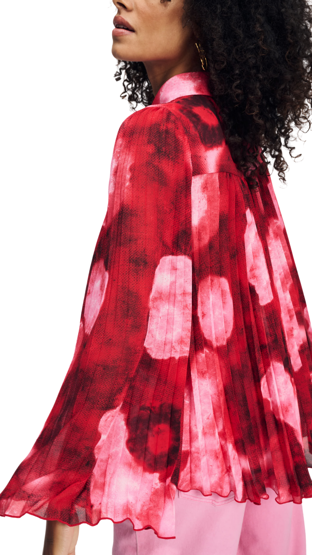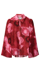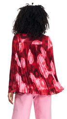 Steal the show in this red/pink blouse, finished with flared sleeves and a back of playful pleated fabric.