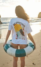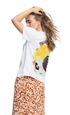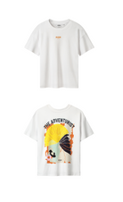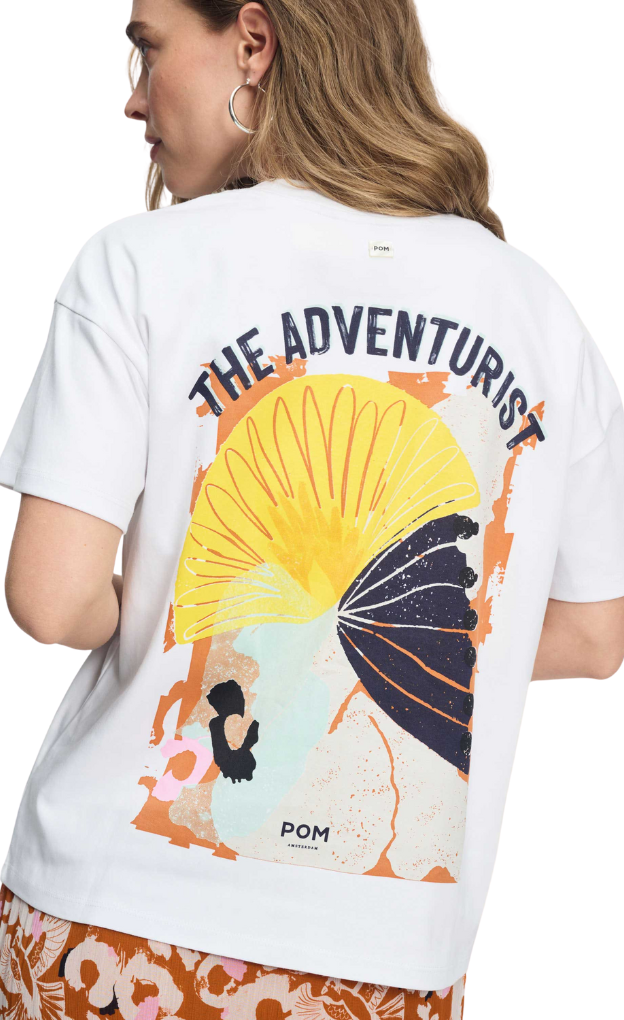 This white T-shirt is made of 100 percent organic cotton and features The Adventurist artwork on the back. The top has a boxy fit with high closed round neckline and ribbing.