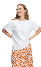 The T-shirt has a boxy fit and short sleeves. Model is 172 and wears a size 36.