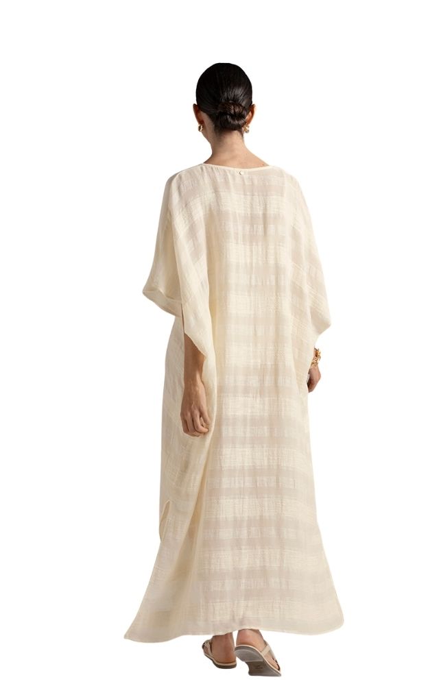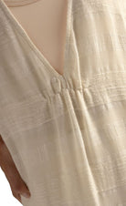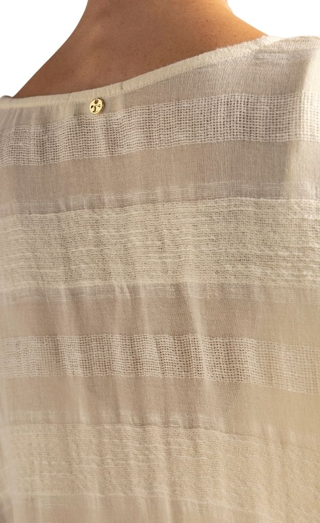 Long cover up in cotton and linen blend with cream color stripes pattern, Deep v neckline, poncho style, gold-plated coin detail characteristic of our brand with "t" engraved .