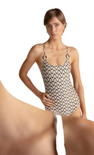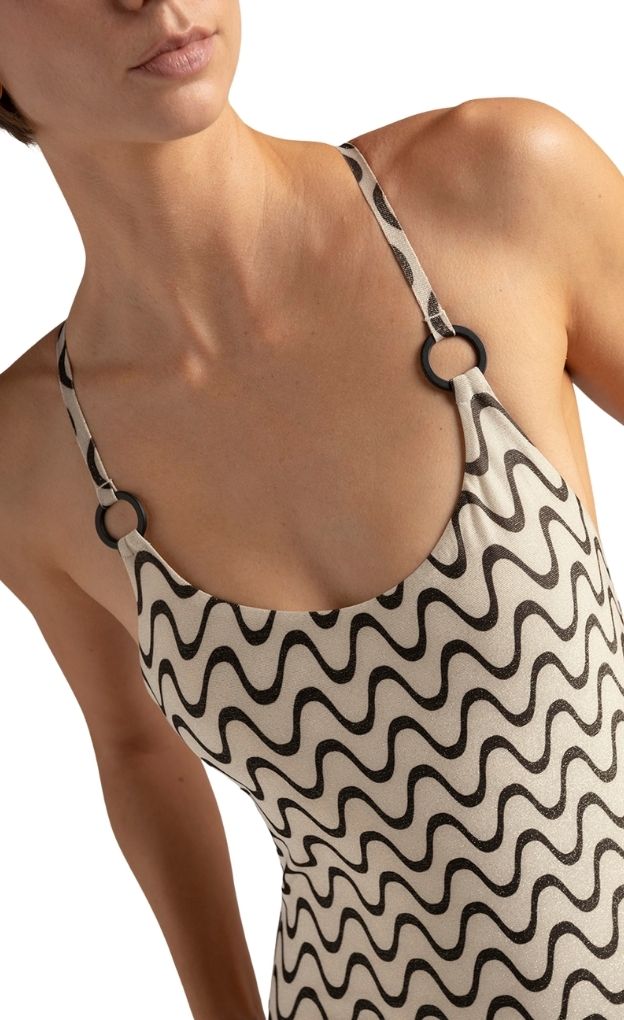 Classic one piece in beige and black print fabric, with lurex, and matte black ring details, adjustable straps for a customizble fit, matte black accessories, removable padding, uv protection fabric.