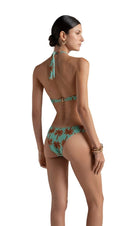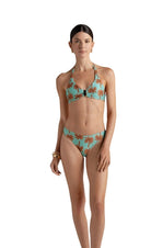 High leg cut bikini bottom in blue and terracotta palm trees print, textured fabric with lurex, gold-plated "t" detail characteristic of our brand, uv protection fabric.