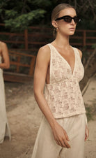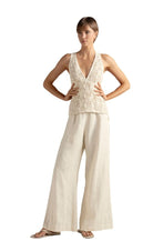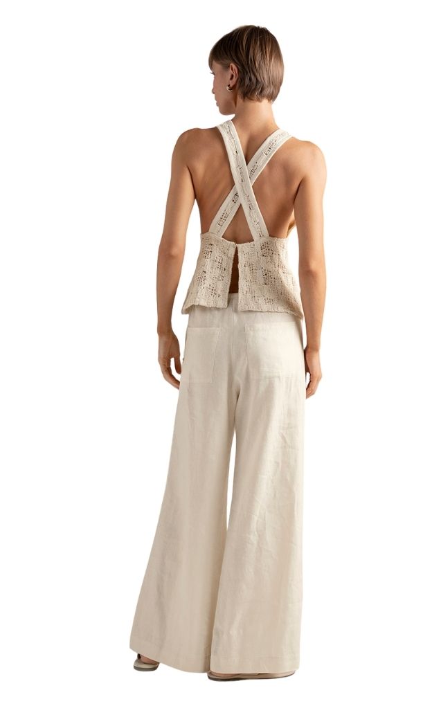 Strappy top in cream knitted cotton fabric with 100% cream linen piping. wide straps cross at the back creating a Deep v neckline, and a back closure with button..