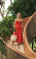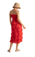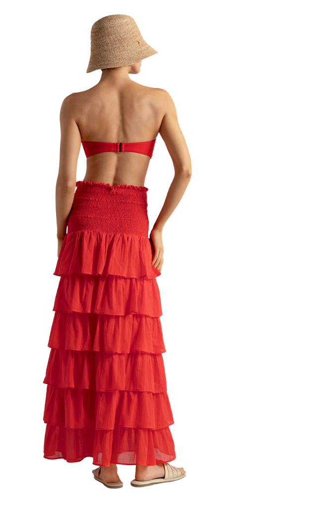 Long skirt in 100% cotton, red color, with smocked waistband and ruffles. it can also be used as a dress, gold-plated coin detail characteristic of our brand with "t" engraved.