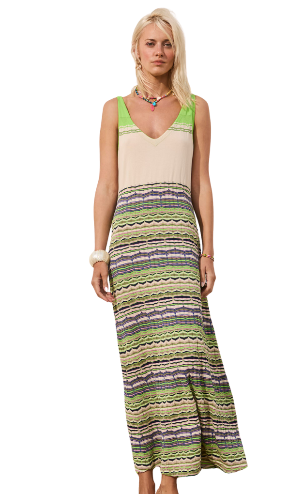 This stunning maxi dress combines a cream bodice with vibrant lime green contrast straps, while the flowing skirt showcases a mesmerizing horizontal stripe pattern in harmonious shades of green, purple, and cream arranged in captivating zigzag motifs.