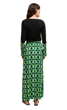 This striking long-sleeved top features a clean black bodice that provides the perfect canvas for the mesmerizing diamond lattice print that adorns the sleeves and lower section, creating an eye-catching interplay of solid and pattern.