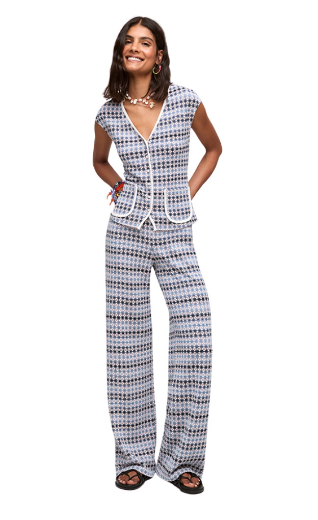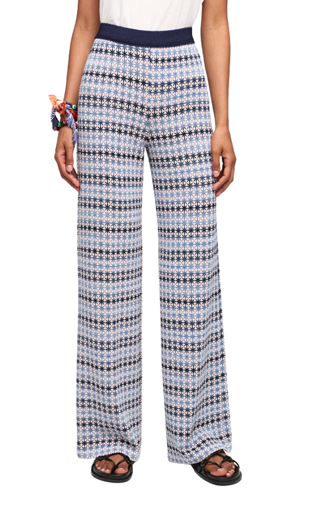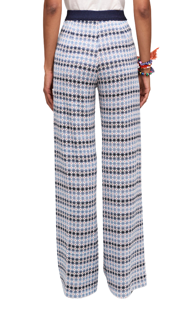 These high-waisted wide-leg pants showcase Aldomartins' signature micro-jacquard pattern in sophisticated navy, light blue, and soft pink tones, creating a striking visual impact that's bold enough to wear solo.