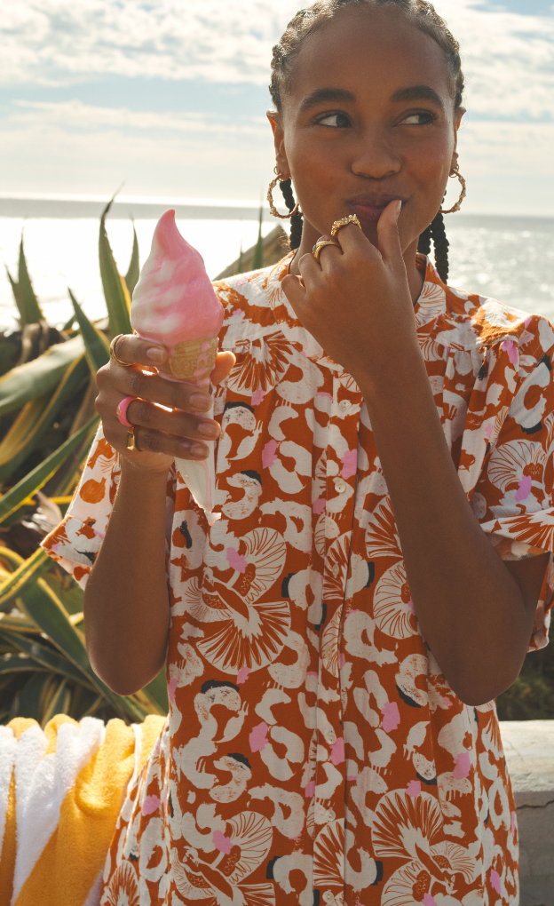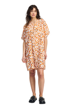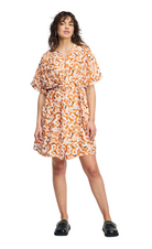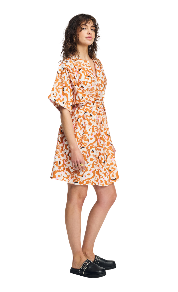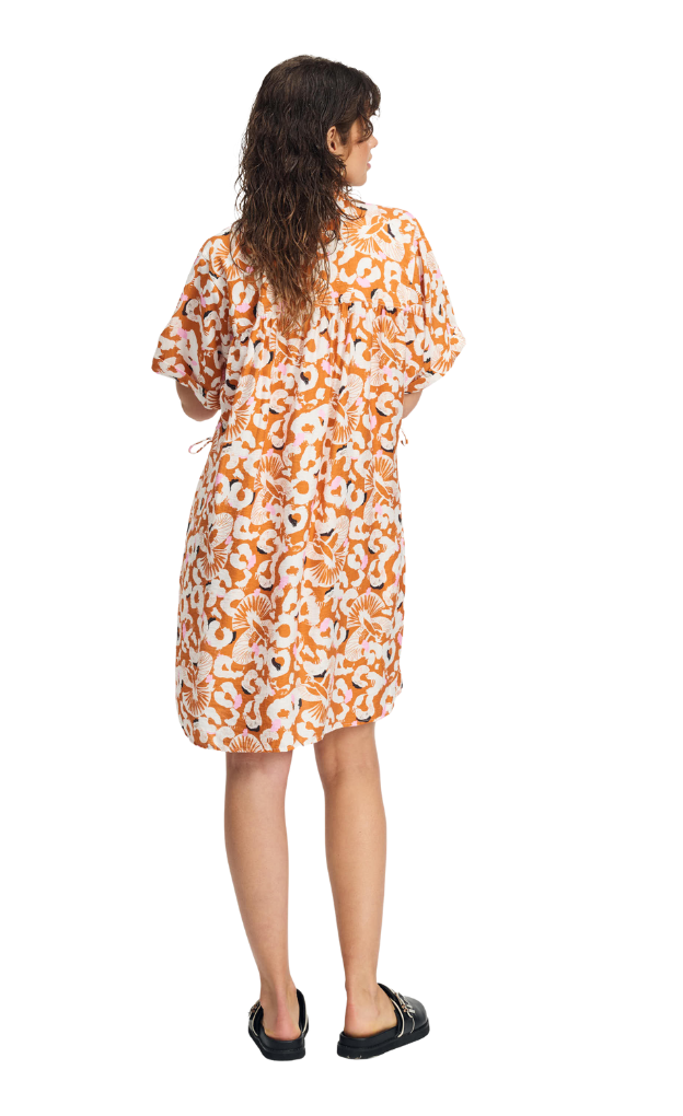 • Orange dress with unique print in white and pink