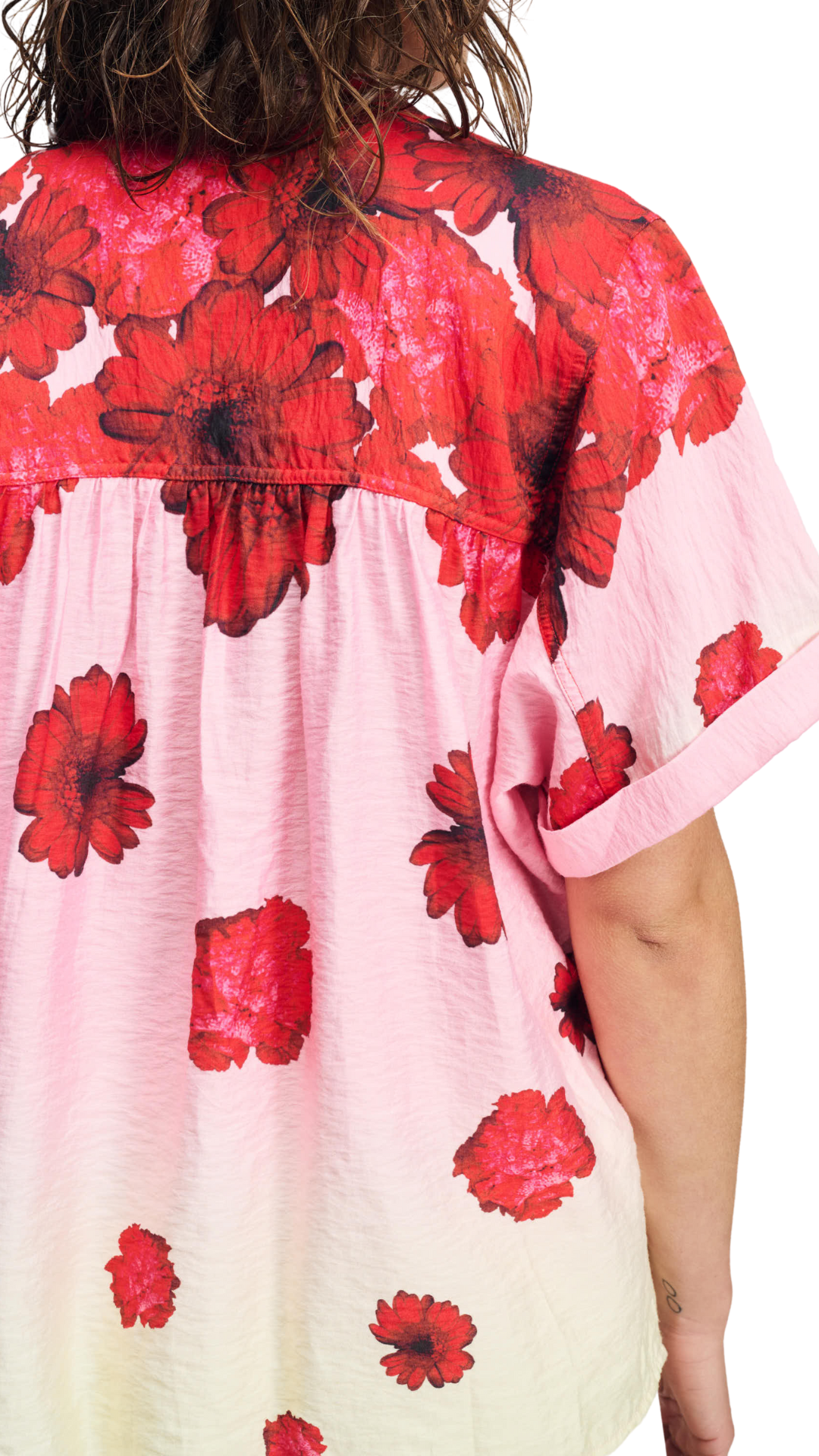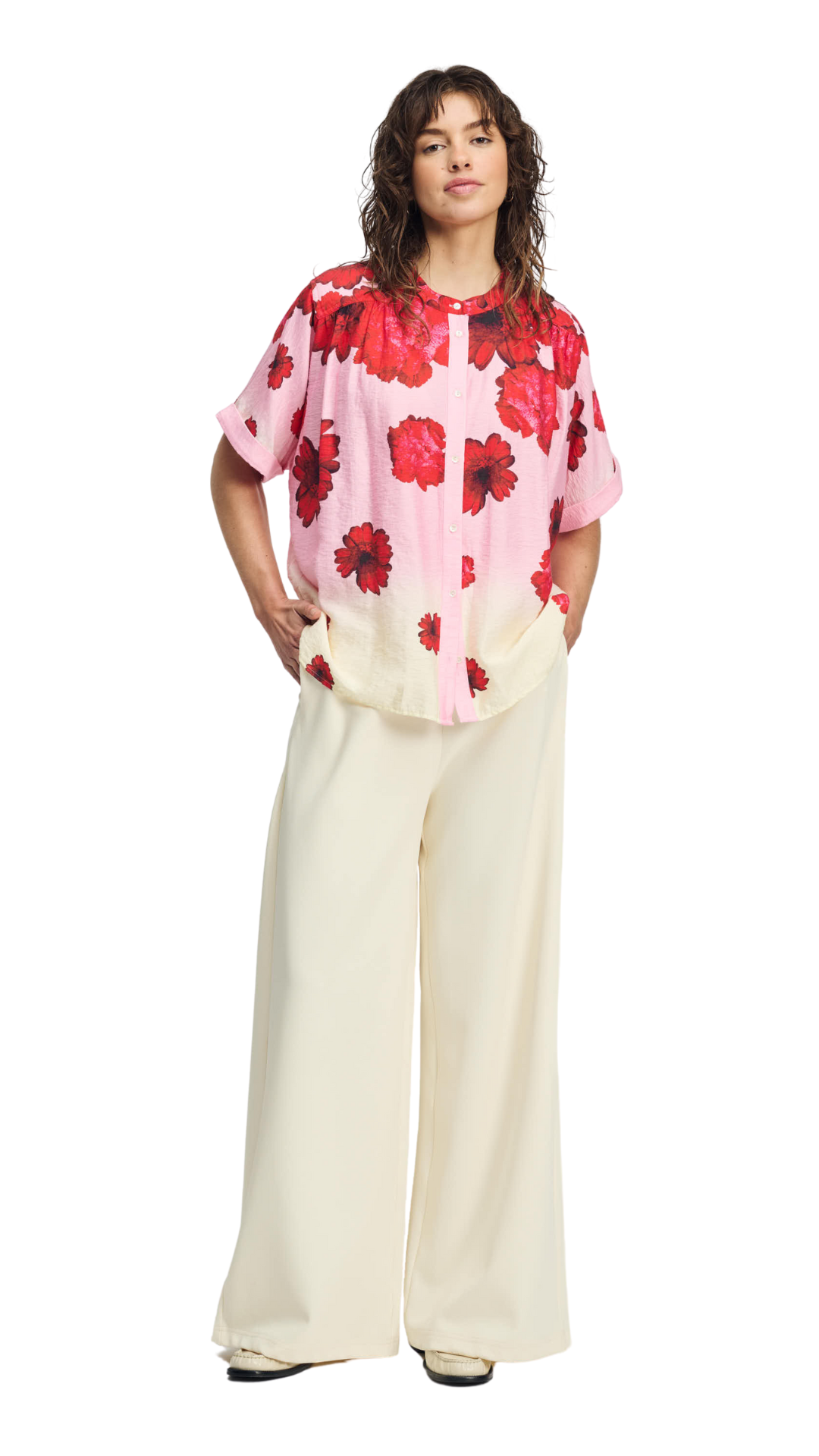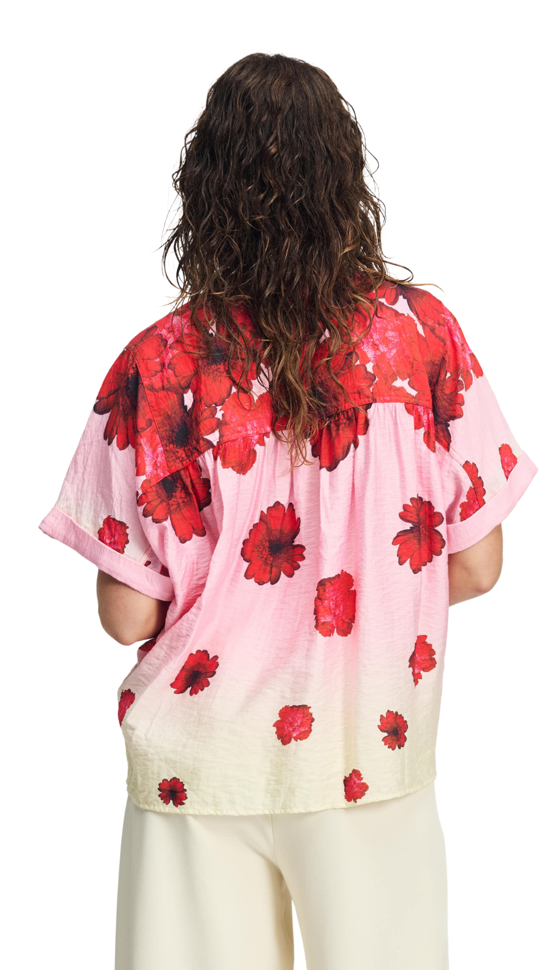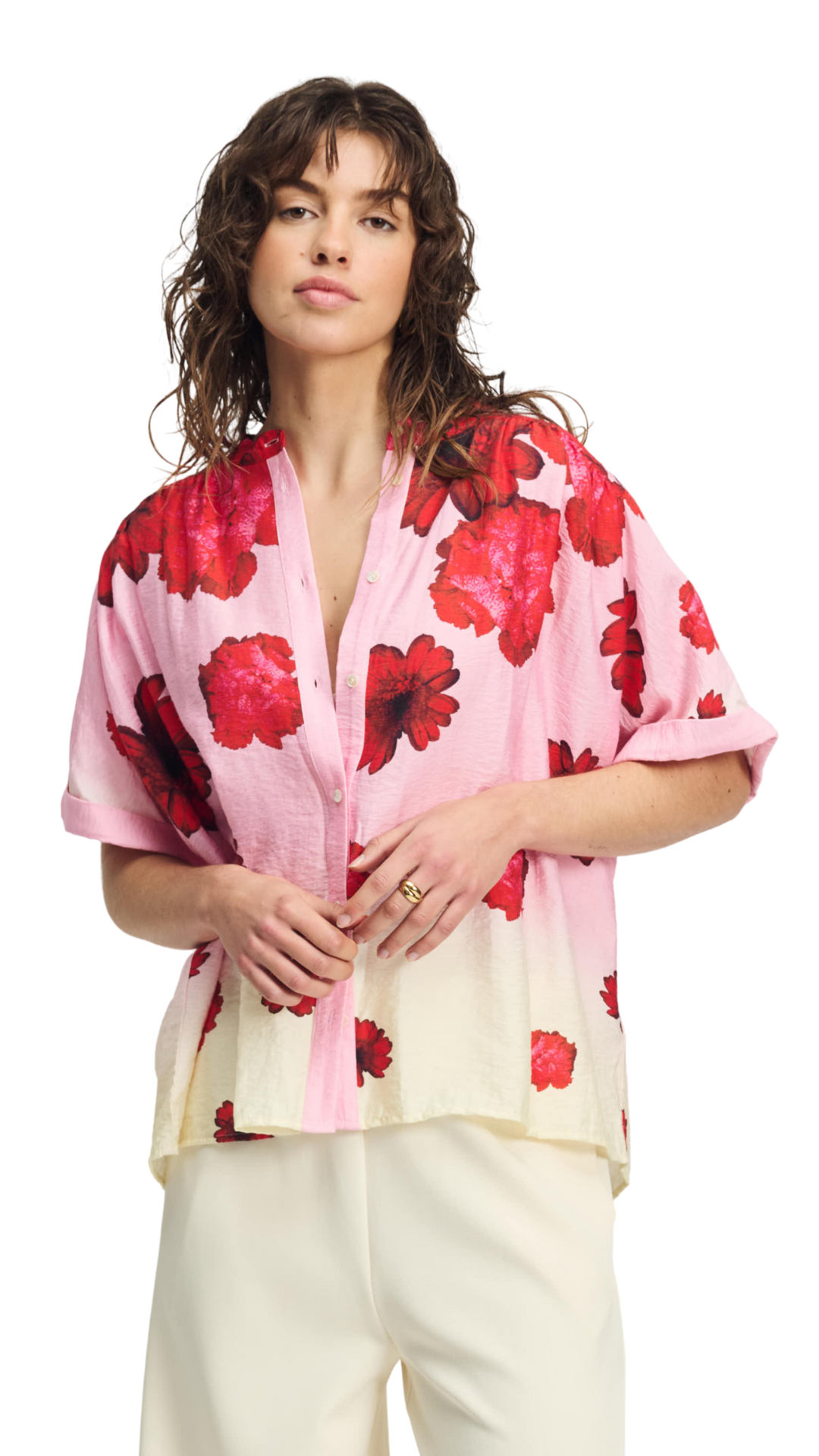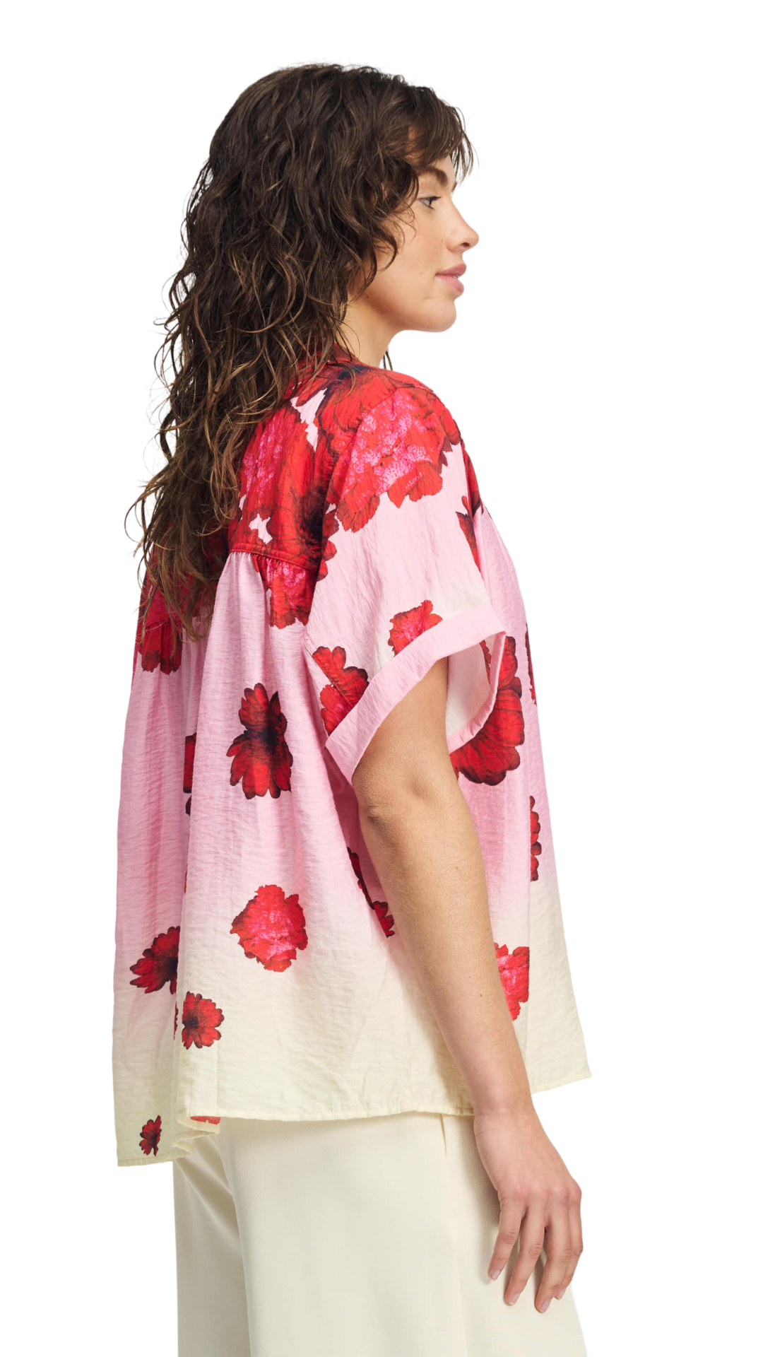 This pink blouse features a colourful floral print. The fabric of the blouse made from LENZING™ ECOVERO™, making this item 'more sustainable'.