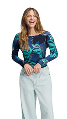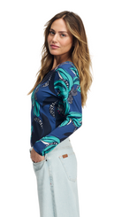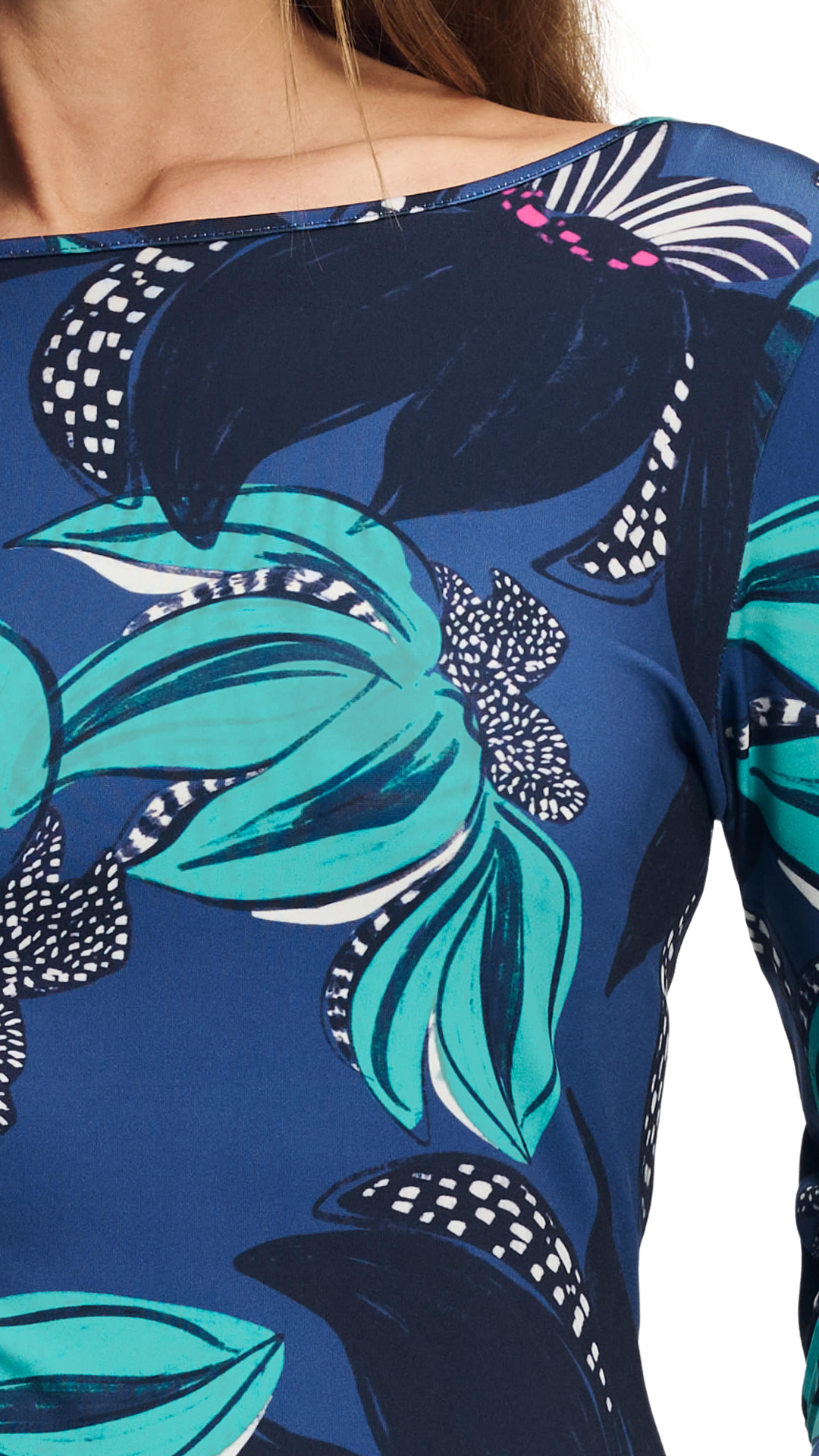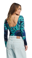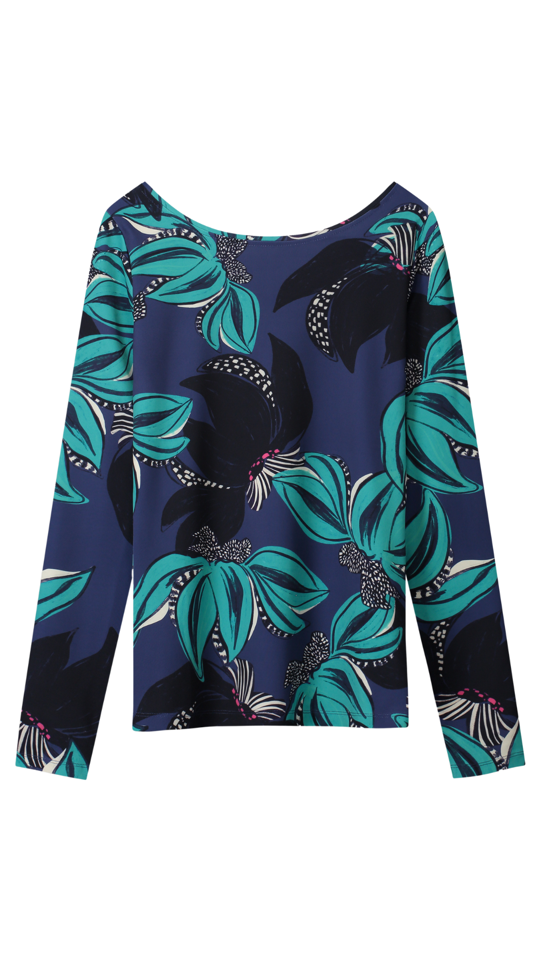 This versatile blue top is reversible and designed to be worn on both sides. One side has a beautiful handmade floral print, while the other side is plain for a more subtle look. The top has an elegant open back and is made from recycled polyester, making this item ‘more sustainable’.