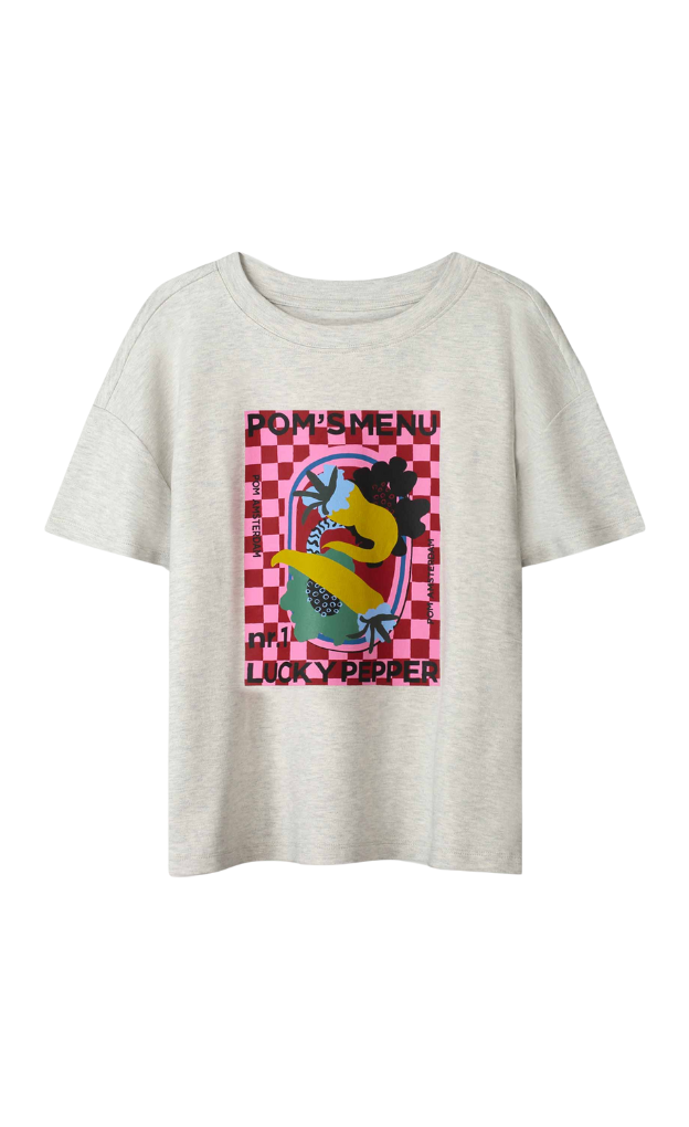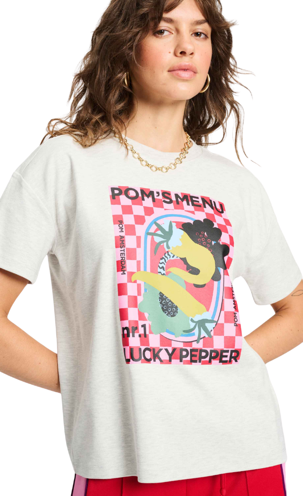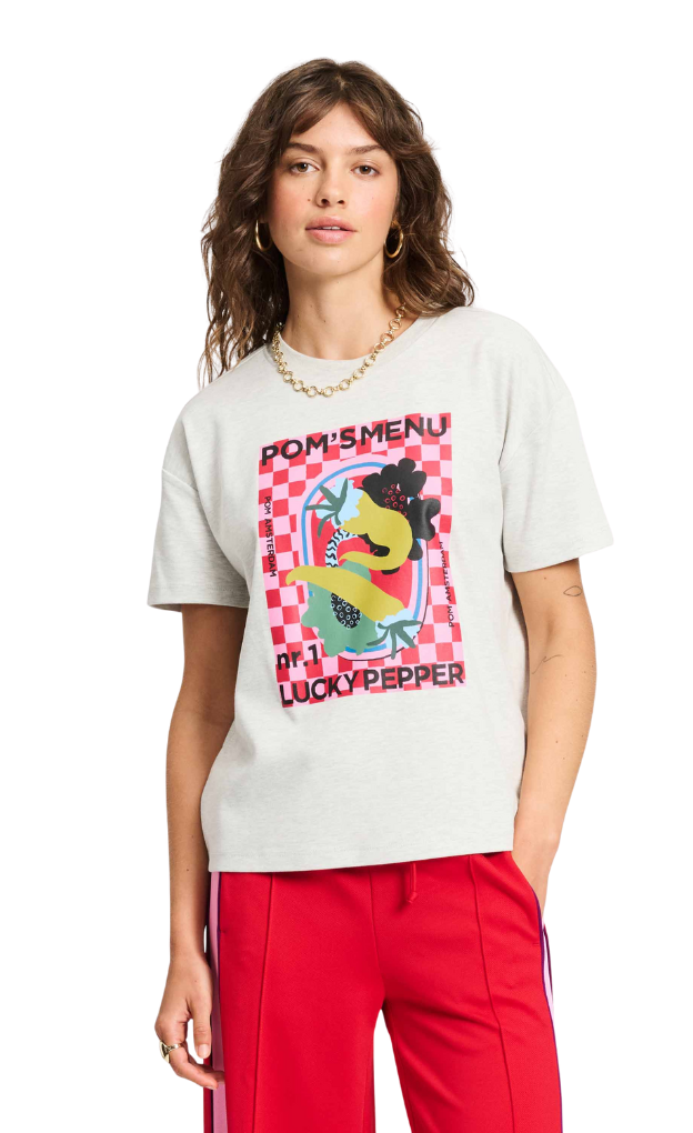 On the menu: style with taste. This heather gray T-shirt features a colorful front print full of food art, checkerboard vibes, and the text "Lucky Pepper."